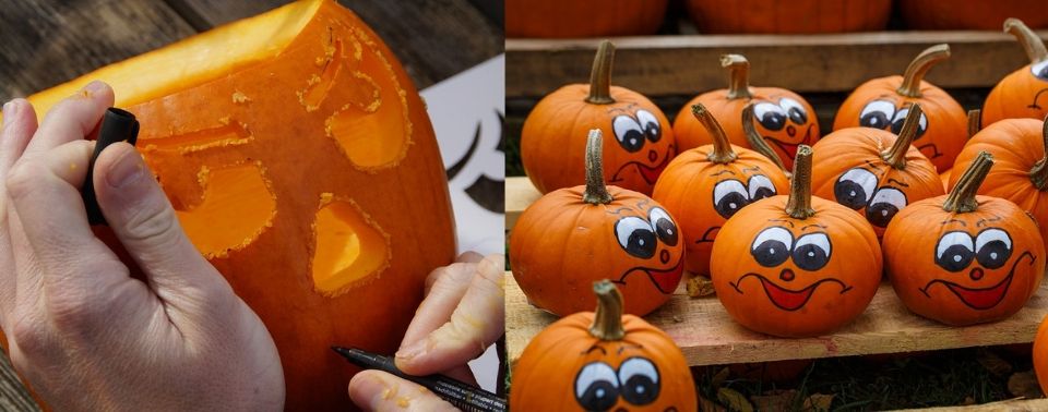 Праздничный фонарь из неё сделать совсем несложно: достаточно срезать верхушку и вынуть мякоть изнутри, затем нарисовать маркером рожицу (если с рисованием совсем плохо, то можно использовать распечатанный трафарет), аккуратно вырезать ножом контуры рисунка и поместить внутрь тыквы свечу. Вместо одной большой тыквы можно сделать несколько маленьких весёлых светильников. Для максимального погружения в атмосферу праздника, можно зажечь ароматические свечи. Также, чёрным маркером можно разрисовать плоды мандаринов и апельсинов.